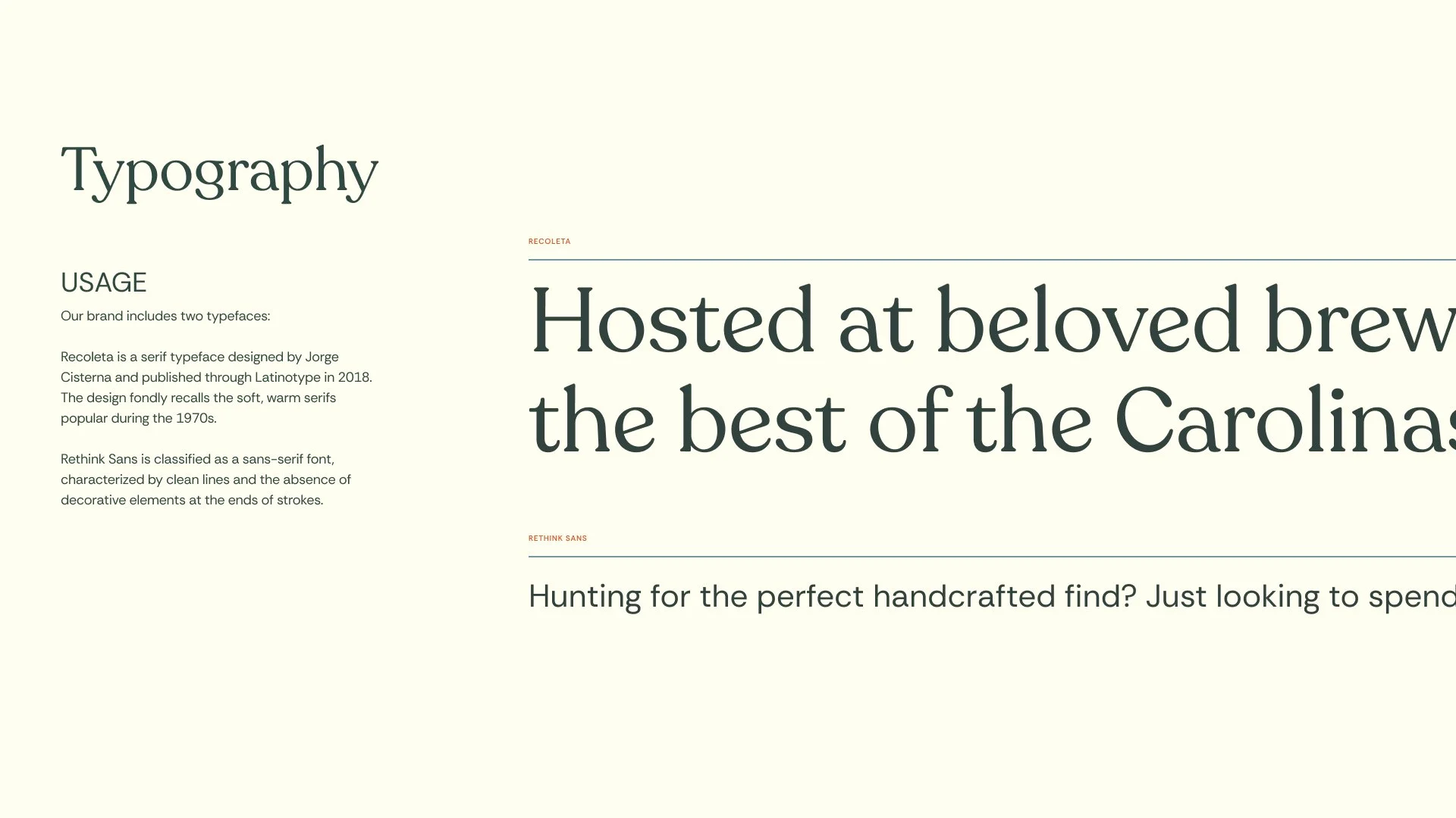 For headlines, we chose Recoleta, a serif that carries the soft, rounded warmth of 1970s typography without feeling costume-y. Rethink Sans balances it out: clean, modern, incredibly hard-working. The two work together the same way the brand does where there’s one foot in nostalgia, and one foot moving forward.
